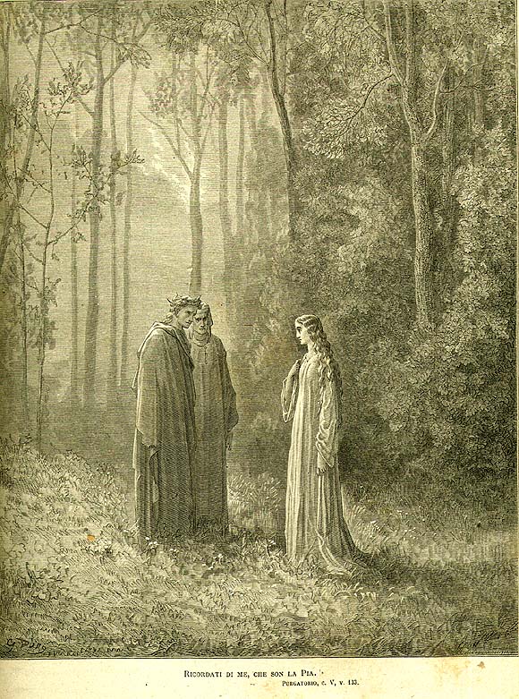 La terza anima ha solo due terzine, eppure sono quelle che hanno reso celebre questo canto. Quando prende parola il suo tono è più sommesso, dolce, materno, lontano dalle descrizioni macabre e tumultuose dei due uomini.